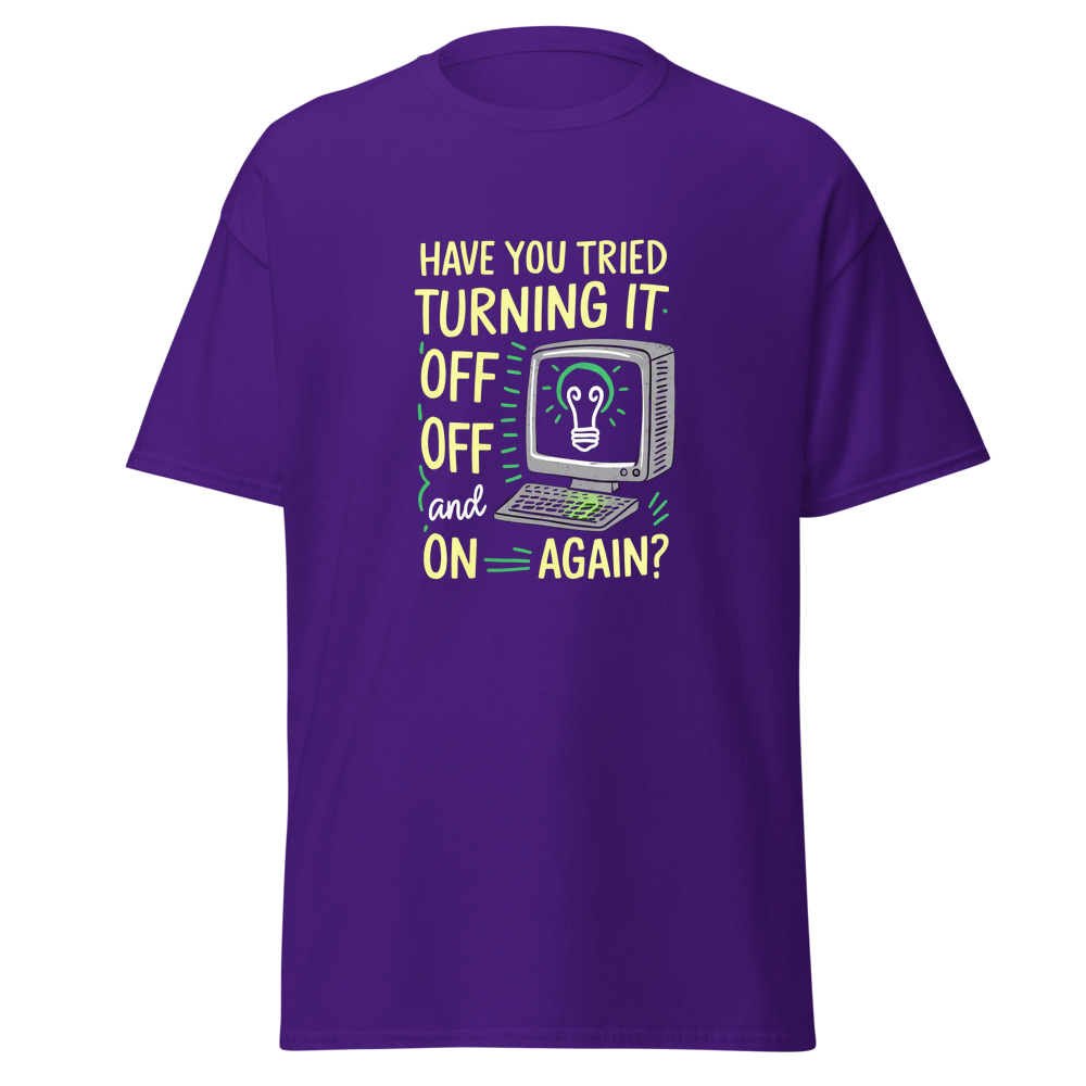 This tee features a quirky cartoon of a computer monitor with a big power button and a lightbulb graphic, perfect for anyone who’s ever faced tech trouble. Ideal for adults and fans of sketch comedy, it’s a fun nod to those all-too-familiar troubleshooting tips.This t-shirt is everything you’ve dreamed of and more. It feels soft and lightweight, with the right amount of stretch. It’s comfortable and flattering for all. 100% combed and ring-spun cotton (Heather colors contain polyester) Fabric weight: 4.2 oz./yd.² (142 g/m²) Pre-shrunk fabric Side-seamed construction Shoulder-to-shoulder taping