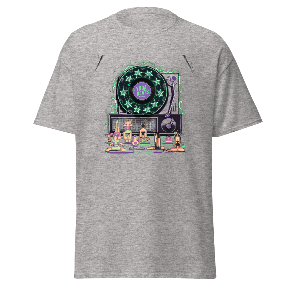 This vintage-inspired t-shirt features an old record player labeled “Yoga Beats” surrounded by playful star patterns. Adorned with pixel art characters in a variety of yoga poses, it’s a unique blend of retro charm and modern wellness vibes. Perfect for yoga enthusiasts who love to stand out.This t-shirt is everything you’ve dreamed of and more. It feels soft and lightweight, with the right amount of stretch. It’s comfortable and flattering for all. 100% combed and ring-spun cotton (Heather colors contain polyester) Fabric weight: 4.2 oz./yd.² (142 g/m²) Pre-shrunk fabric Side-seamed construction Shoulder-to-shoulder taping